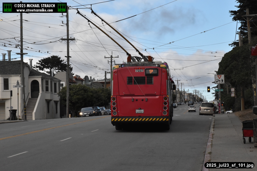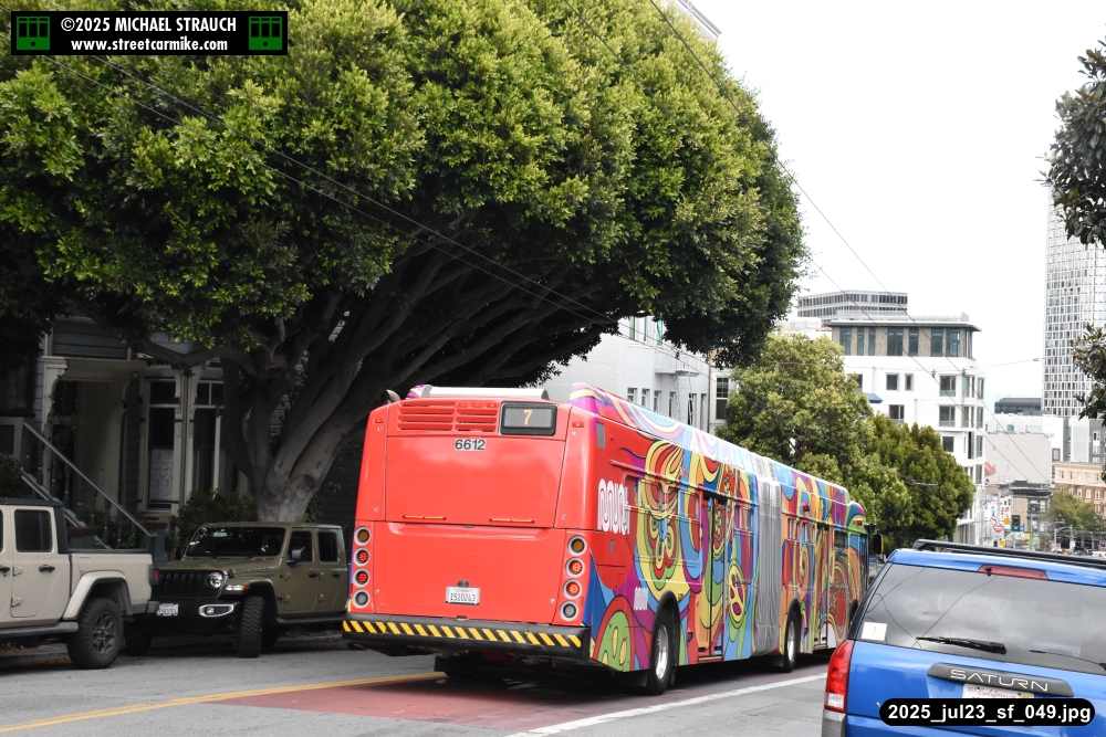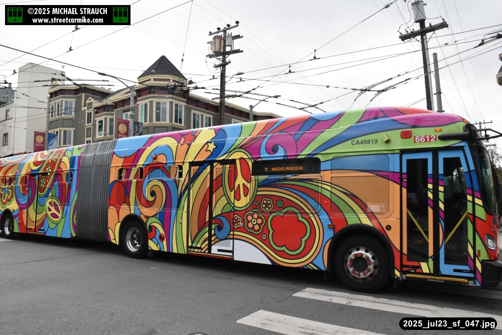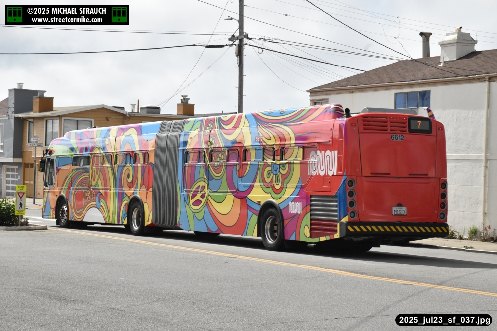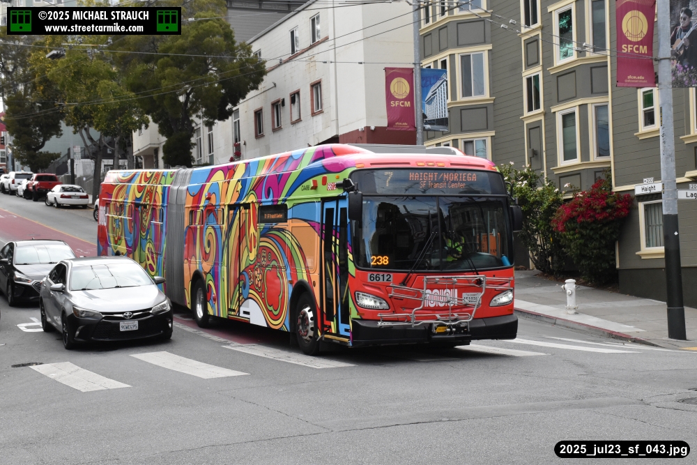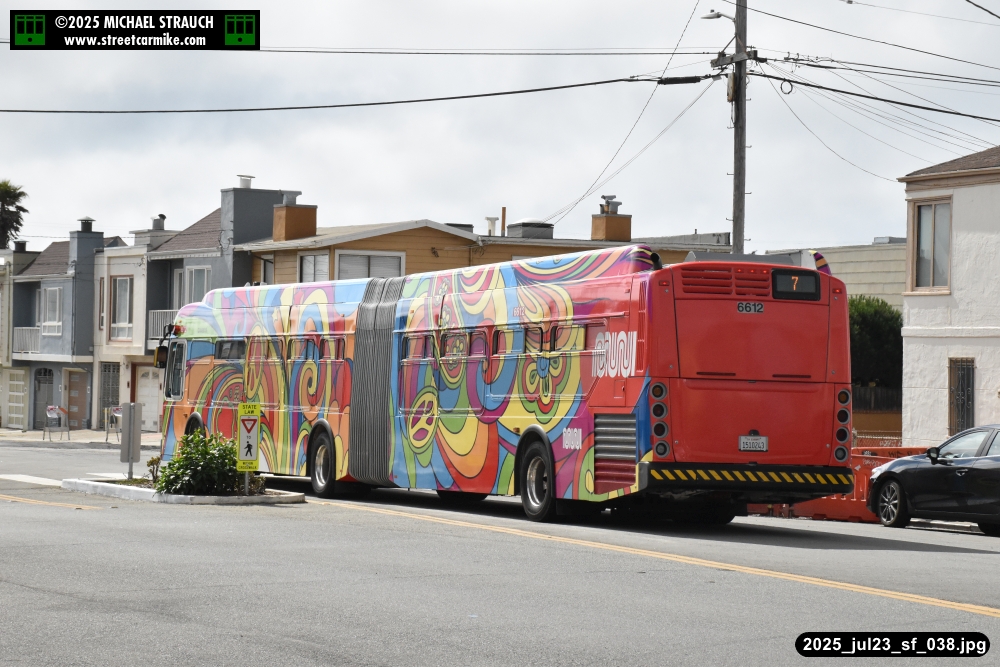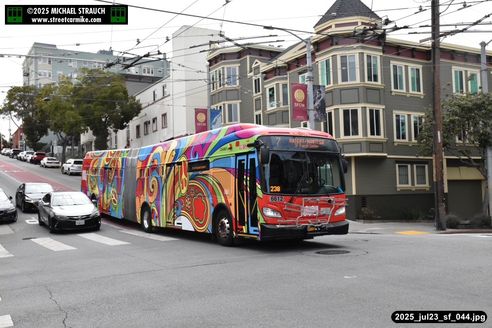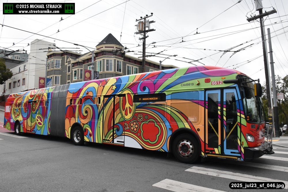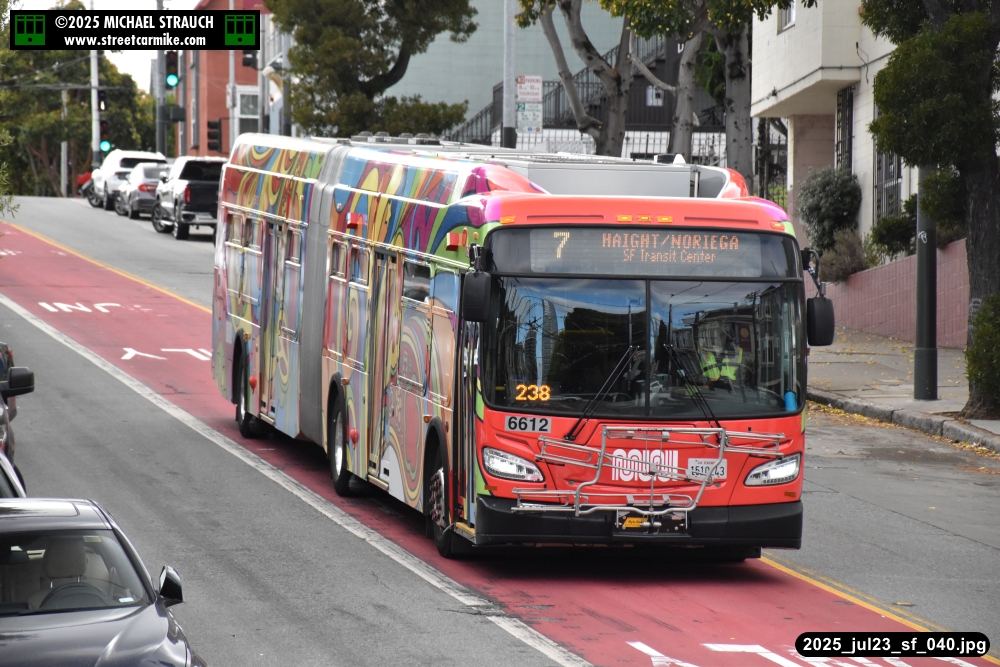 are Siemens 2046 operating N Judah, New Flyer 6612 on the 7 Haight/Noriega, and New Flyer 7227